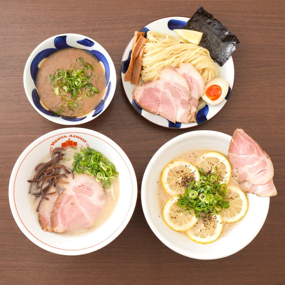 ラーメン、レモンとんこつラーメン、つけ麺が各1食ずつ入った麺也オールウェイズの商品を食べ比べできるセットです。