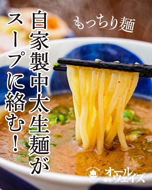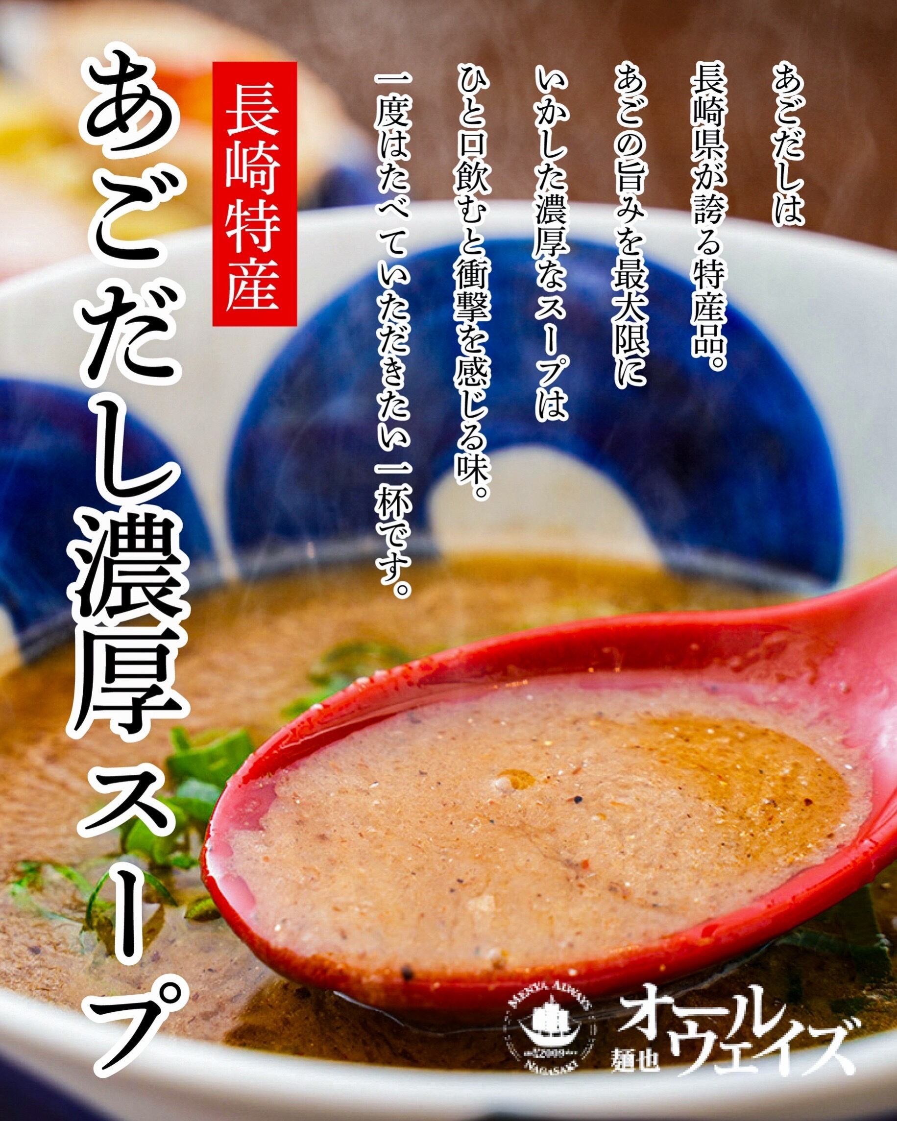 長崎特産あご出汁をふんだんに使用し、九州産のとんこつを2日間かけて仕込む特製とんこつスープを合わせて誕生した逸品。長崎あご出汁魚介つけ麺は令和5年長崎ブランド新作展最優秀賞に輝きました‼︎